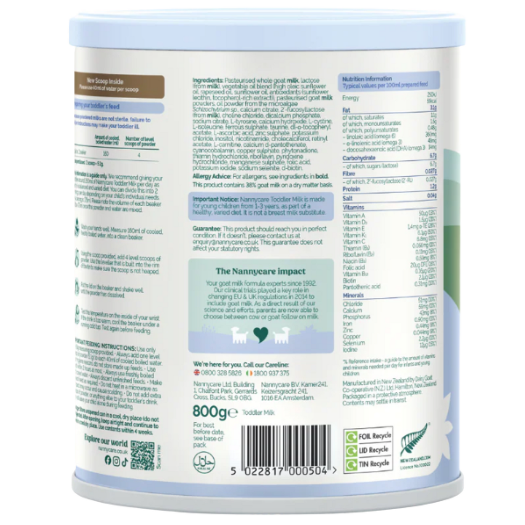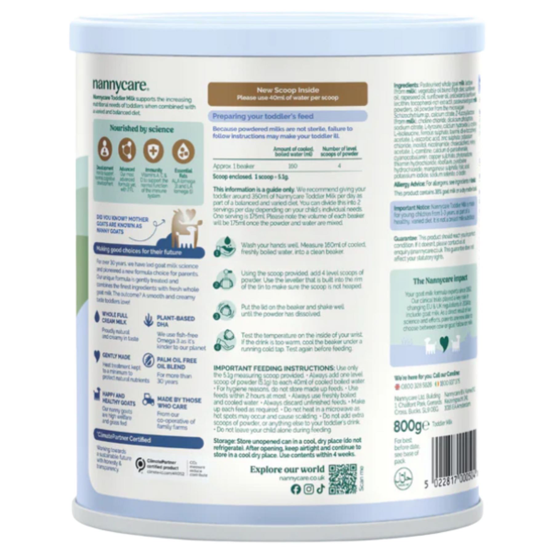 Pasteurised whole goat milk, lactose (from milk), vegetable oil blend (high oleic sunflower oil, rapeseed oil, sunflower oil, antioxidants (sunflower lecithin, tocopherol-rich extract), pasteurised goat milk powders, marine fish oil powder (source of docosahexaenoic acid), minerals, choline chloride, L-tyrosine, L-tryptophan, L-cystine, vitamins, L-isoleucine, taurine, L-carnitine.