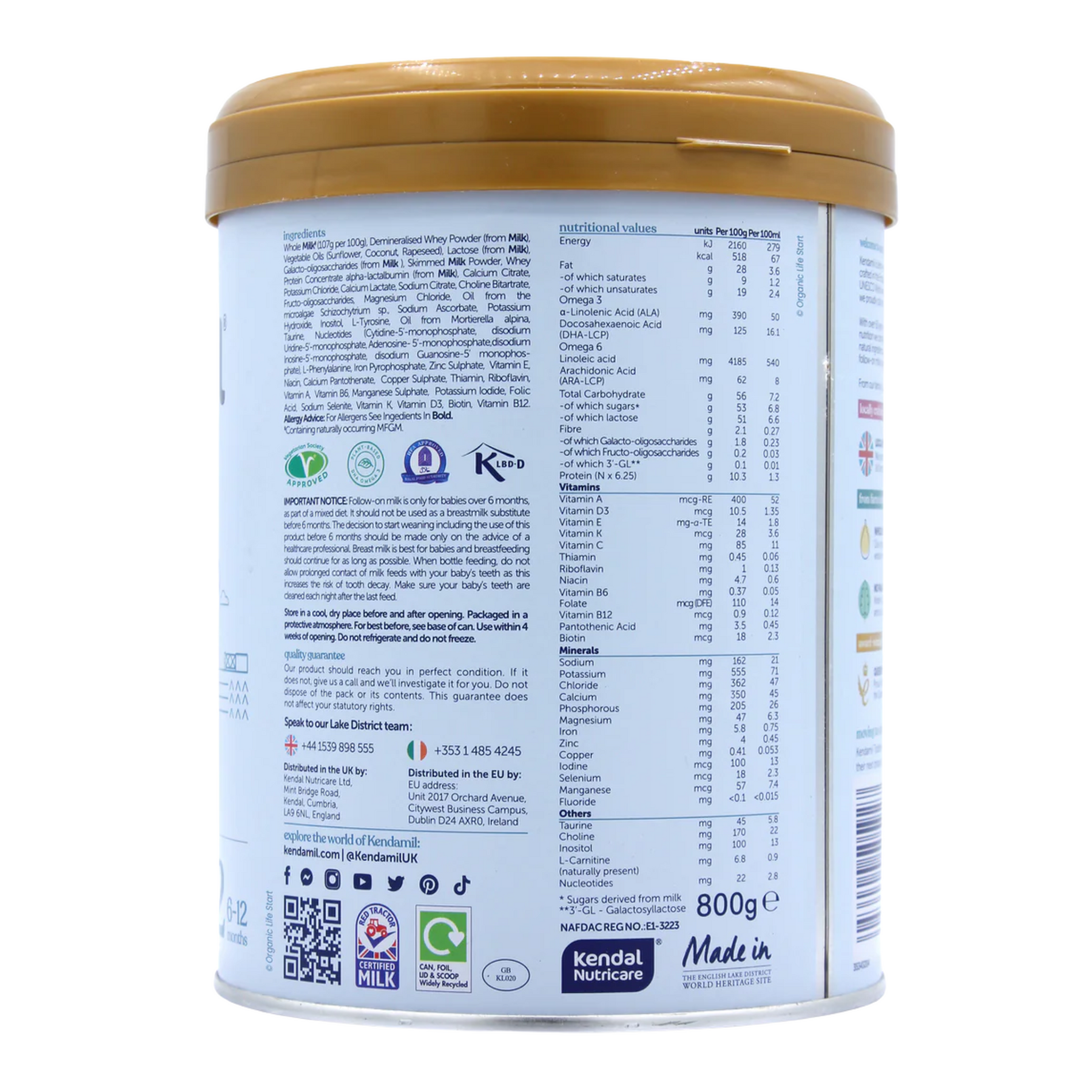 Whole Milk (190g per 100g), Lactose (from Milk), Demineralised Milk Whey Powder (enriched in alpha lactalbumin), Vegetable Oils (Sunflower, Coconut, Rapeseed), Galacto-oligosaccharides (from Milk), Skimmed Milk Powder, Calcium Citrate, Potassium Chloride, Sodium Citrate, Magnesium Chloride, Potassium Hydroxide, Docosahexaenoic Acid, Sodium Ascorbate, Inositol, Arachidonic Acid, Taurine, Choline Bitartrate, L Tyrosine, Nucleotides(Cytidine-5’-monophosphate, disodium Uridine-5’-monophosphate, Adenosine-5’-monophosphate, disodium Inosine-5’-monophosphate, disodium Guanosine-5’ monophosphate), Iron Pyrophosphate, L Phenylalanine, L Carnitine, Zinc Sulphate, Vitamin E, Niacin, Calcium Pantothenate, Copper Sulphate, Thiamin, Riboflavin, Vitamin A, Vitamin B6, Manganese Sulphate, Folic Acid, Potassium Iodide, Sodium Selenite, Vitamin K, Vitamin D, Biotin, Vitamin B12.