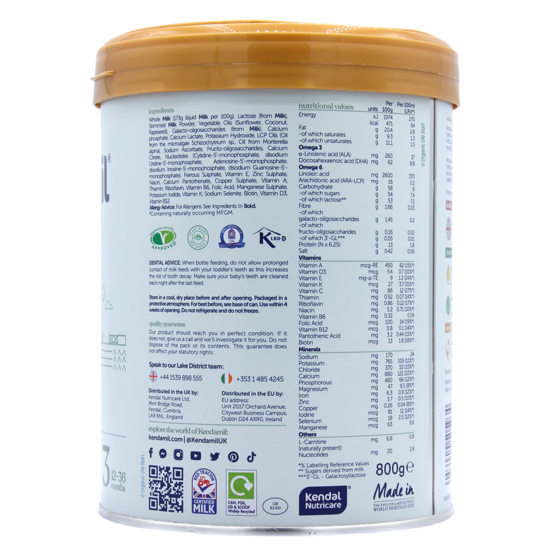 Whole Milk (223g liquid Milk per 100g), Lactose (from Milk), Skimmed Milk Powder, Vegetable Oils (Sunflower, Coconut, Canola), Galacto-oligosaccharides (from Milk), Calcium phosphate, Calcium lactate, LCP Oils (Oil from Mortierella alpina, Oil from the microalgae Schizochytrium sp.), Sodium ascorbate, Calcium citrate, Iron Pyrophosphate, Potassium hydroxide, Nucleotides(Cytidine-5’-monophosphate, disodium Uridine-5’- monophosphate, Adenosine-5’-monophosphate, disodium Inosine-5’-monophosphate, disodium Guanosine-5’ monophosphate), Vitamin E, Niacin, Zinc Sulphate, Ferric Ammonium Citrate, Calcium Pantothenate, Vitamin A, Thiamin, Vitamin B6, Copper Sulphate, Manganese Sulphate, Folic Acid, Potassium Iodide, Riboflavin, Sodium Selenite, Vitamin K, Biotin, Vitamin D3, Vitamin B12.