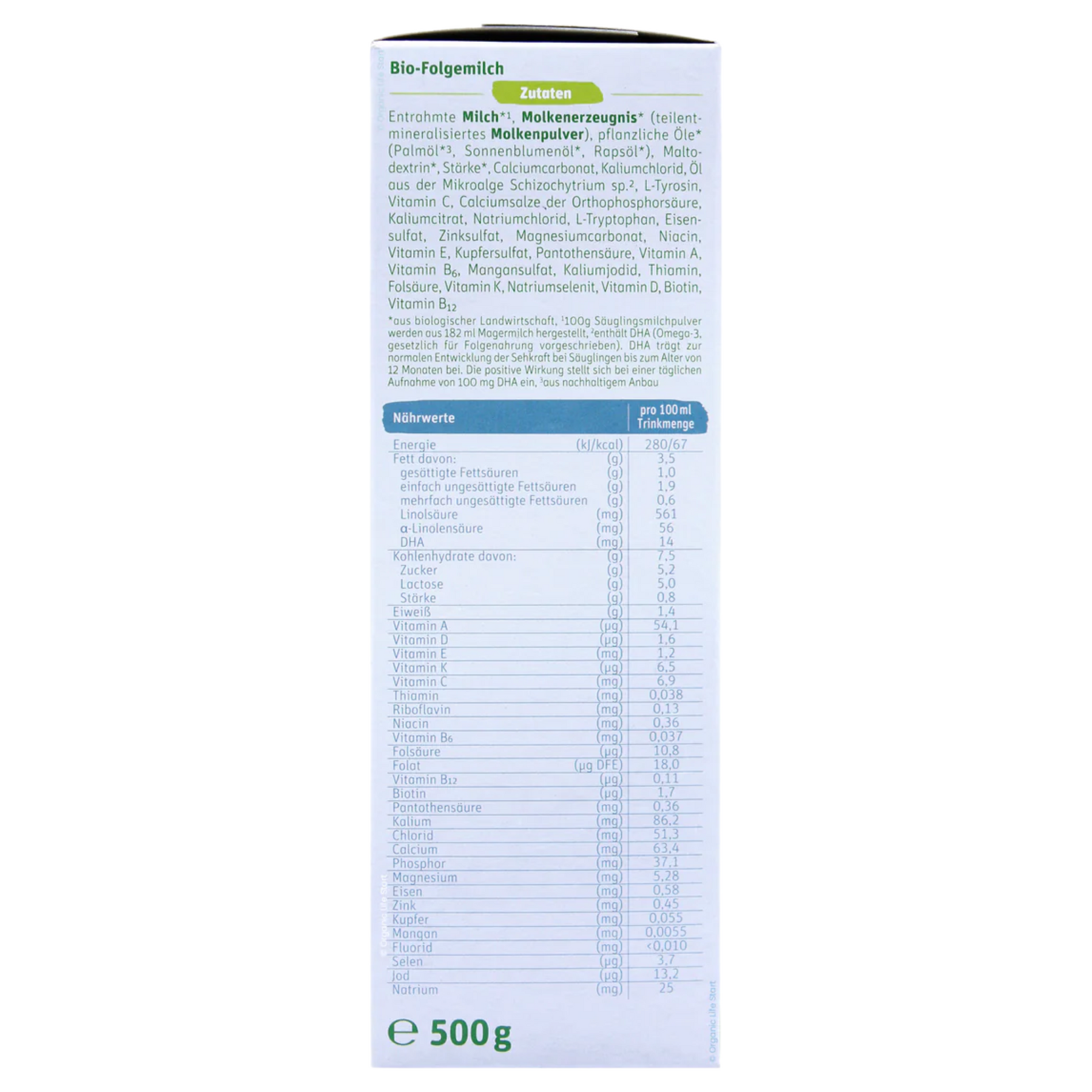 Organic skimmed milk*¹, organic whey powder (partially demineralized), organic vegetable oils [organic palm oil*², organic sunflower oil, organic rapeseed oil], organic maltodextrin, organic starch, calcium carbonate, potassium chloride, oil from the microalgae Schizochytrium sp.*³, L-tyrosine, vitamin C, calcium salts of orthophosphoric acid, potassium citrate, sodium chloride, L-tryptophan, iron sulfate, zinc sulfate, magnesium carbonate, niacin, vitamin E, copper sulfate, pantothenic acid, vitamin A, vitamin B6, manganese sulfate, potassium iodide, thiamin, folic acid, vitamin K, sodium selenite, vitamin D, biotin, vitamin B12