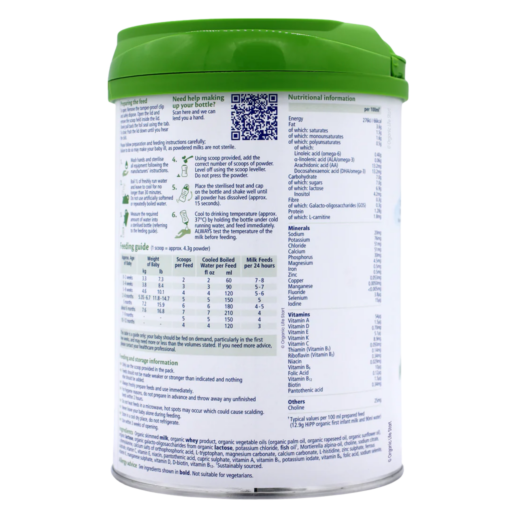 Organic skimmed milk, organic whey product, organic vegetable oils (organic palm oil, organic rapeseed oil, organic sunflower oil), organic lactose, organic galacto-oligosaccharides from organic lactose, potassium chloride, fish oil1, Mortierella alpina-oil, choline, sodium citrate, L-phenylalanine, calcium salts of orthophosphoric acid, L-tryptophan, magnesium carbonate, calcium carbonate, L-histidine, zinc sulphate, ferrous sulphate, vitamin C, vitamin E, niacin, pantothenic acid, cupric sulphate, vitamin A, vitamin B1, potassium iodate, vitamin B6, folic acid (calcium-L-methyfolate ⁴), sodium selenite, vitamin K, manganese sulphate, vitamin D, D-biotin, vitamin B12.