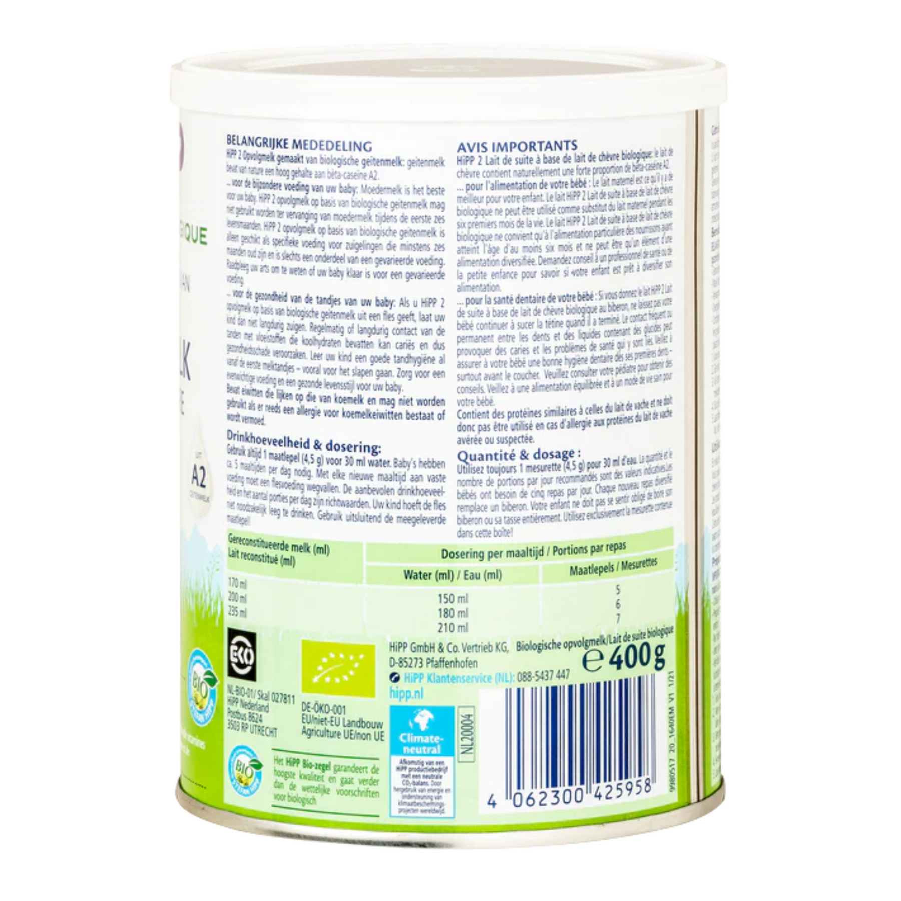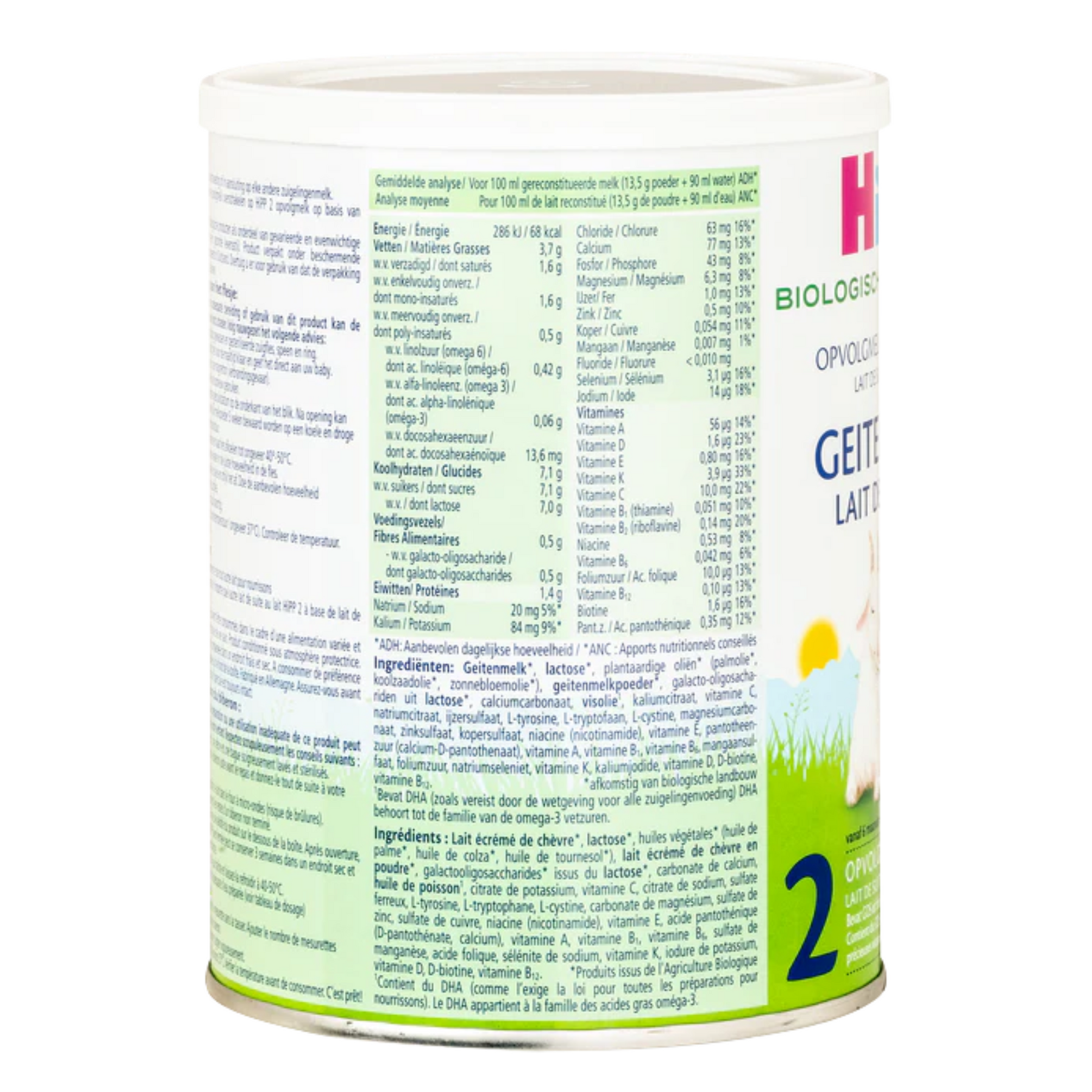 HiPP Dutch Goat Stage 2 is a gentle, organic goat milk formula made for babies 6–12 months. With A2 goat milk protein and clean European ingredients, it’s a great next step for little ones who need a smoother option as they grow, become more active, and start eating more solids.