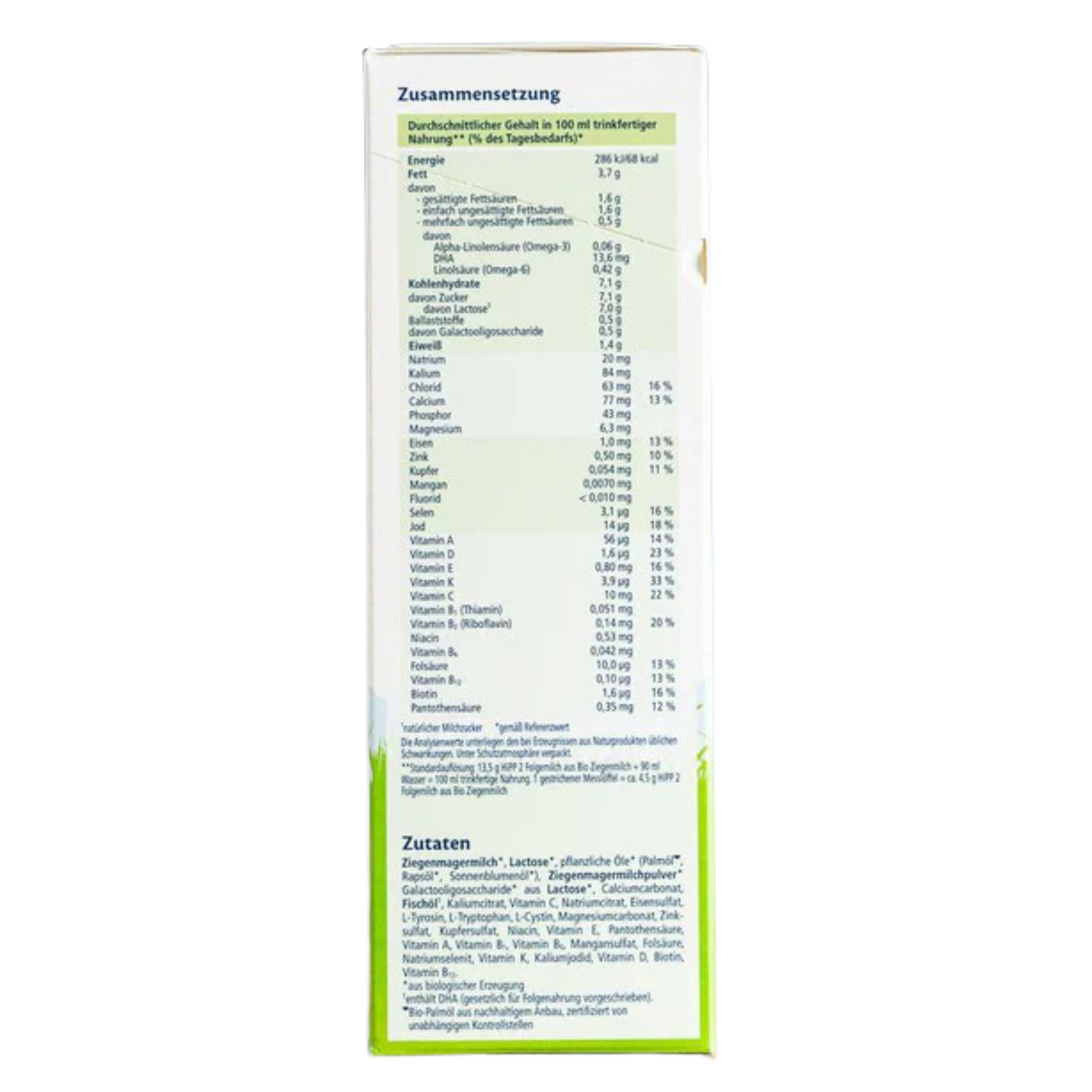 Goat skim milk*, lactose*, vegetable oils* (palm oil, rapeseed oil*, sunflower oil*), goat skim milk powder*. Galactooligosaccharides* from lactose*, calcium carbonate, fish oil1, potassium citrate, vitamin C, sodium citrate, ferrous sulfate, L-tyrosine, L-tryptophan, L-cystine, magnesium carbonate, zinc sulfate, copper sulfate, niacin, vitamin E, pantothenic acid, Vitamin A, Vitamin B1, Vitamin B6, Manganese sulfate, Folic acid, sodium selenite, vitamin K, potassium iodide, vitamin D, biotin, vitamin B12.