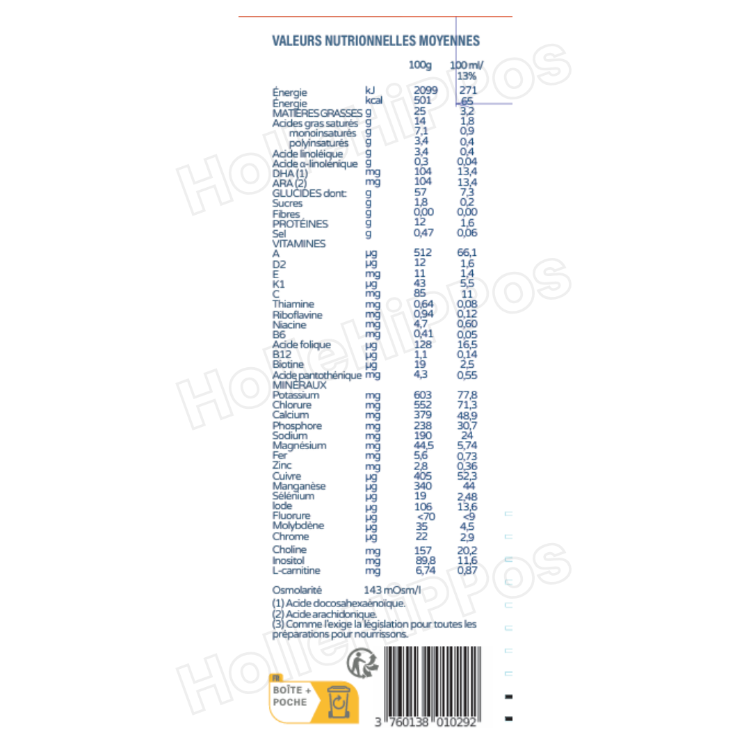 Maltodextrin (from corn), vegetable oils (sunflower, medium-chain triglycerides, coconut, rapeseed), hydrolyzed rice protein*, sunflower lecithin*, oil from the micro-algae Schizochytrium (source of DHA), natural tocopherols extracted from sunflower, Mortierella alpina oil (standardized for arachidonic acid–ARA). Minerals: natural calcium carbonate (Lithothamnium), di-calcium phosphate, natural magnesium oxide, potassium chloride, sodium phosphate, ferrous lactate, zinc sulphate, copper sulphate, manganese sulphate, sodium selenite, potassium iodide, sodium molybdate, chromium III chloride hexahydrate. Vitamins: A (retinol acetate), D2 (ergocalciferol), E (natural α-tocopherol), K1 (phylloquinone), C (ascorbic acid), B1 (thiamine mononitrate), B2 (riboflavin), B6 (pyridoxine hydrochloride), B12 (cyanocobalamin), pantothenic acid (calcium pantothenate), niacin (niacinamide), folic acid, biotin, choline bitartrate, inositol. Amino acids: L-lysine, L-tryptophan, L-carnitine.